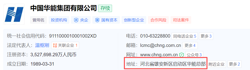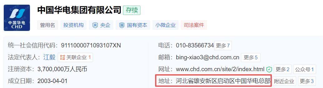 华电集团的注册地址已变更为:河北省雄安新区启动区中国华电总部。