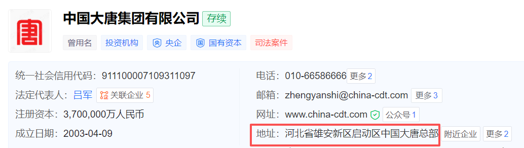 大唐集团的注册地址已变更为:河北省雄安新区启动区中国大唐总部。