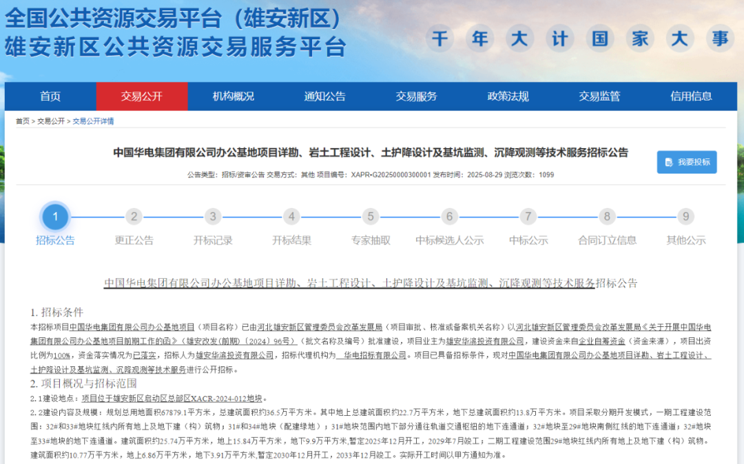 2025年8月,雄安新区公共资源交易服务平台发布中国华电集团有限公司办公基地项目详勘、岩土工程设计、土护降设计及基坑监测、沉降观测等技术服务招标公告。