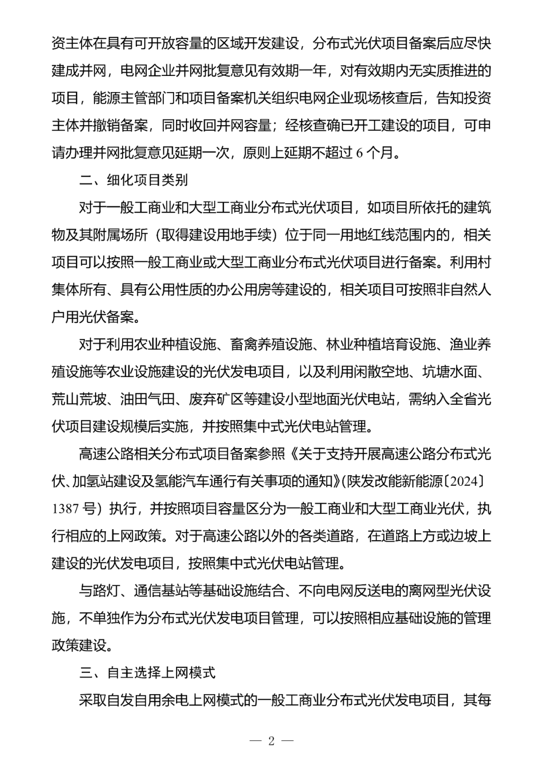 高速公路相关分布式项目备案参照《关于支持开展高速公路分布式光伏、加氢站建设及氢能汽车通行有关事项的通知》(陕发改能新能源〔2024〕1387号)执行,并按照项目容量区分为一般工商业和大型工商业光伏,执行相应的上网政策。对于高速公路以外的各类道路,在道路上方或边坡上建设的光伏发电项目,按照集中式光伏电站管理。