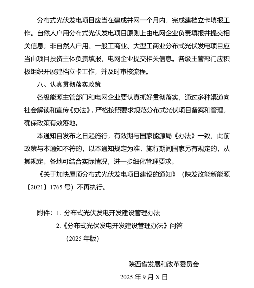 公开征求意见时间截止到2025年9月30日,请将意见建议电子版发送至邮箱fgwxnyc@shaanxi.gov.cn,邮件主题为“姓名(或单位)+关于贯彻落实《分布式光伏发电开发建设管理办法〉的通知(征求意见稿)建议”。纸质信件:邮寄至陕西省西安市新城大院29号楼318室(邮编:710006)。