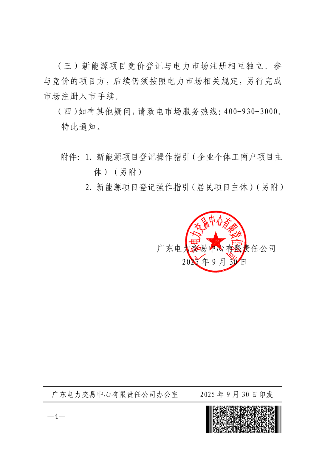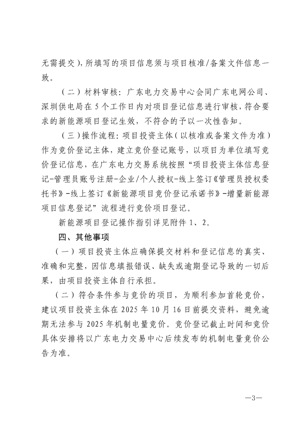 文件提出:计划参与机制竞价的风电、光伏项目,2025年10月1日起,登录“广东电力交易系统”,通过“新能源项目登记入口”办理竞价登记”,并在10月16日前提交资料,否则将无法参与竞价。