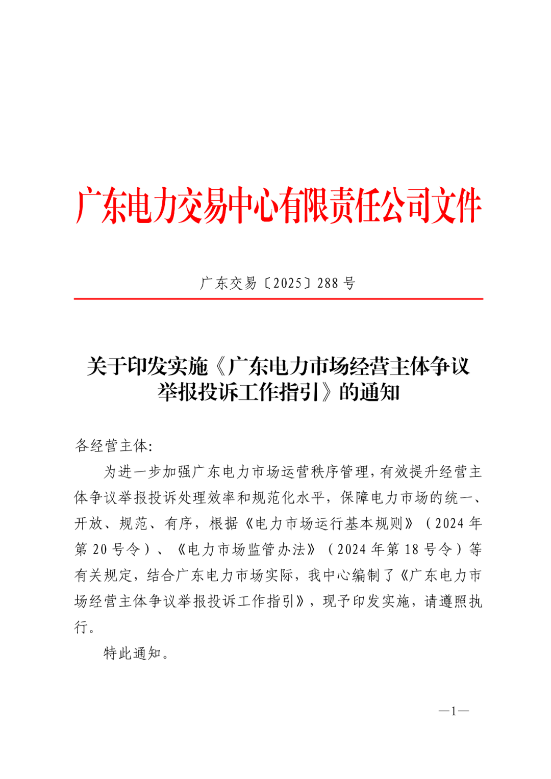 10月31日,广东电力交易中心印发实施《广东电力市场经营主体争议举报投诉工作指引》的通知。