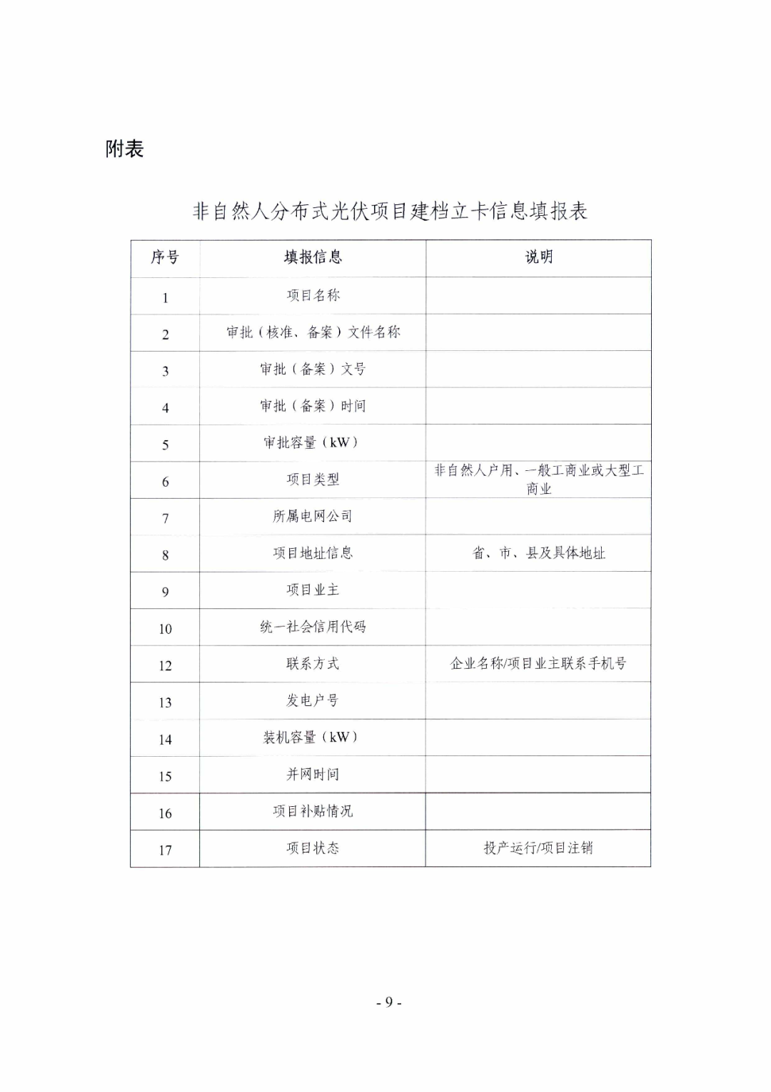 文件要求,新增项目(含增量配电网、地方电网项目)应当在建成并网一个月内,完成建档立卡填报工作。其中,自然人户用项目,由电网企业负责填报并提交建档立卡相关信息。非自然人户用、一般工商业、大型工商业项目,应当由项目投资主体或项目业主负责向电网企业申报建档立卡所需信息。