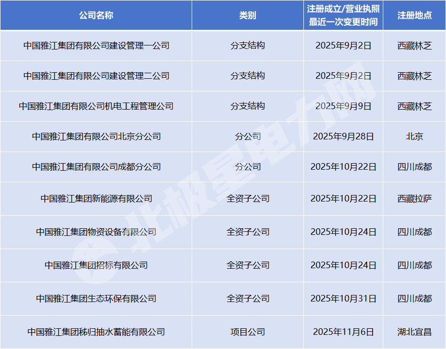 2025年7月,同样因国家战略开发雅鲁藏布江下游水电工程而生的中国雅江集团有限公司正式组建。在其成立后的约半年内,一系列组织架构的设立相继展开。根据公开的工商信息显示,中国雅江集团已陆续设立10家下属公司与分支机构。这些公司的注册时间、地点和经营范围,为我们初步观察这家新晋央企的早期发展思路,提供了一组现实的注脚。
