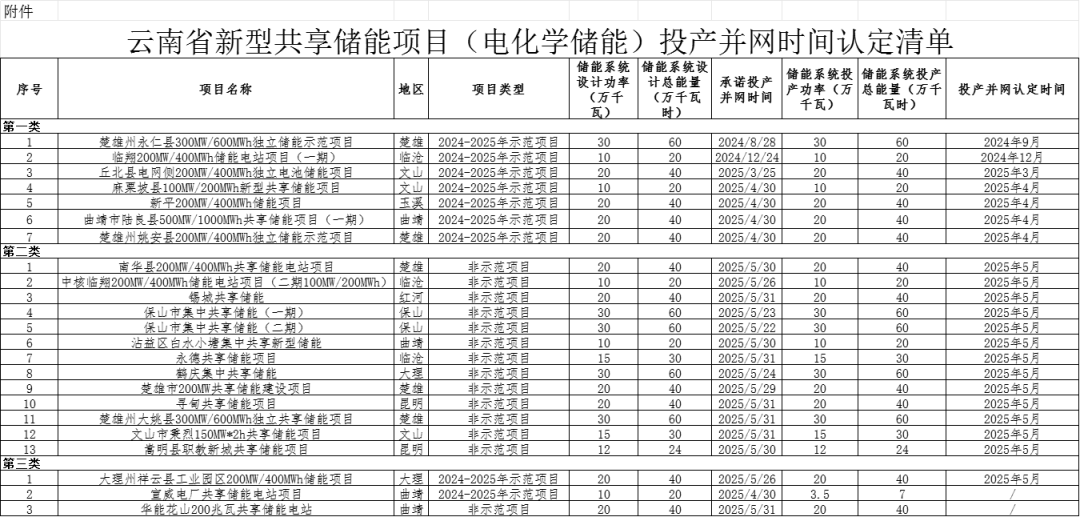 按照《云南省发展和改革委员会 云南省能源局关于印发〈云南省新型储能发展实施方案(2024—2025年)〉的通知》(云能源科技〔2024〕98号)(以下简称《实施方案》)、《云南省发展和改革委员会 云南省能源局关于进一步推进新型共享储能发展的通知》(云能源科技〔2025〕1号)、《云南省电化学储能项目投产并网时间技术认定指南(试行)》《云南省能源局关于开展新型共享储能项目(电化学储能)投产并网时间认定的通知》(云能源办科技〔2025〕136号)等要求,省能源局会同有关单位开展了新型共享储能项目(电化学储能)投产并网时间认定工作。