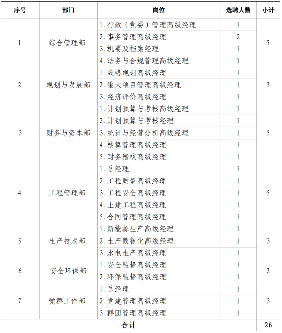 11月28日,国家电投再发布《国家电投集团水电产业平台公司筹备组公开选聘公告》,面向国家电投集团系统内公开选聘工程管理部总经理、党群工作部总经理等25岗共计26人。