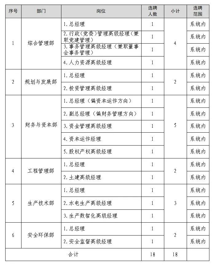 而在今年7月,国家电投也曾发布过一则《国家电投集团水电产业平台公司筹备组人员公开选聘公告》,彼时是公开选聘综合管理部总经理、规划与发展部总经理等18岗共计18人。
