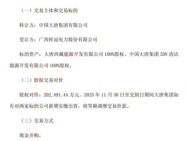 2025年12月29日,桂冠电力公告称,拟以现金方式收购大唐集团持有的大唐西藏能源开发有限公司100%股权(以下简称“大唐西藏公司”)、中国大唐集团ZDN清洁能源开发有限公司100%股权(以下简称“大唐ZDN公司”),交易价款总金额为20.25亿元。