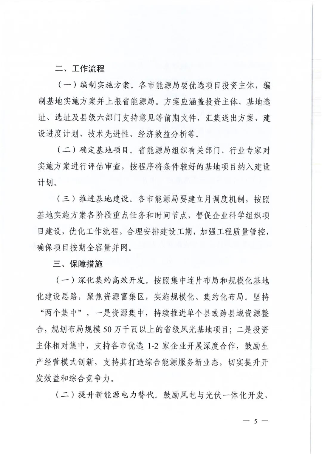 《方案》明确,深化集约高效开发。按照集中连片布局和规模化基地化建设思路,聚焦资源富集区,实施规模化、集约化布局。坚持"两个集中”,一是资源集中,持续推进单个县或跨县域资源整合,规划布局规模50万千瓦以上的省级风光基地项目;二是投资主体相对集中,支持各市优选1-2家企业开展深度合作,鼓励生产经营模式创新,支持其打造综合能源服务新业态,切实提升开发效益和综合竞争力。