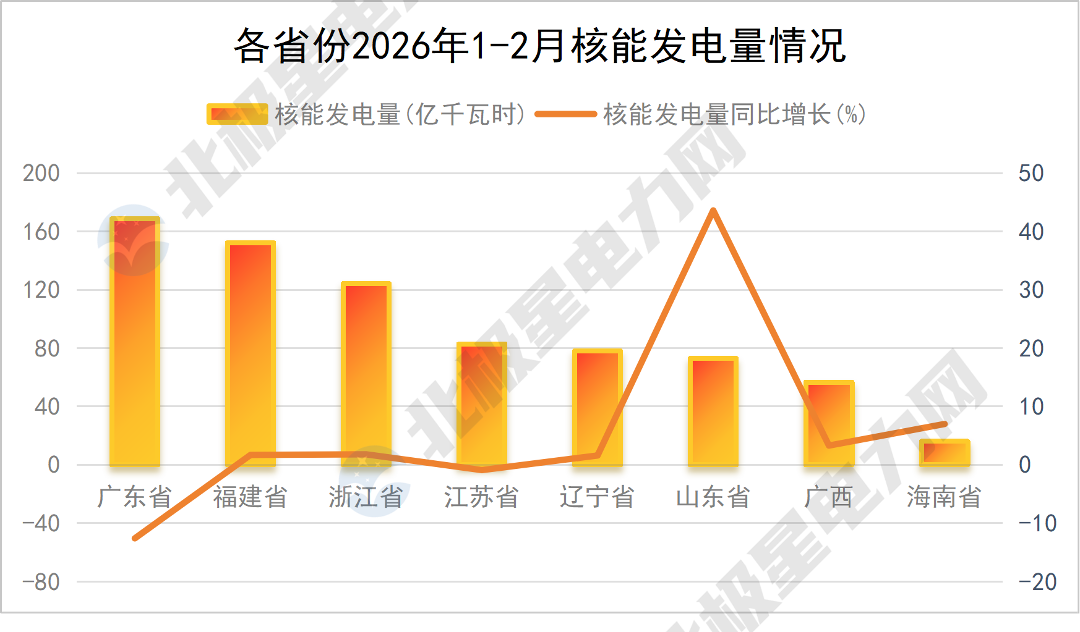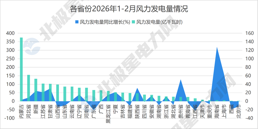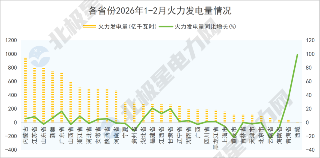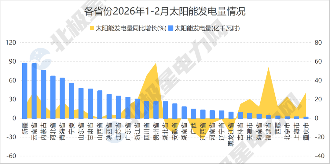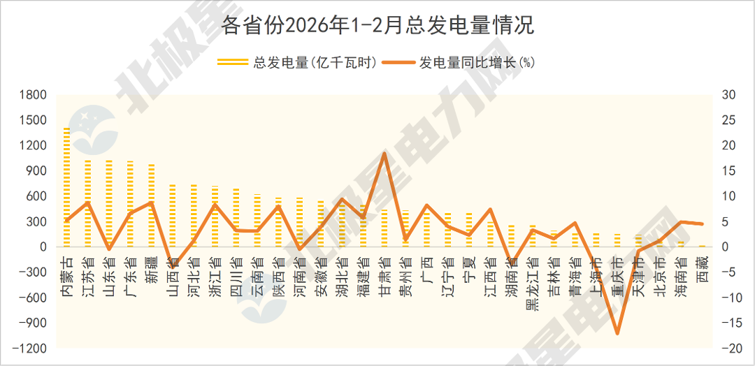 北极星电力网整理了31个省份2026年1-2月份的发电量数据,包括火电、水电、核电、风电、光伏。