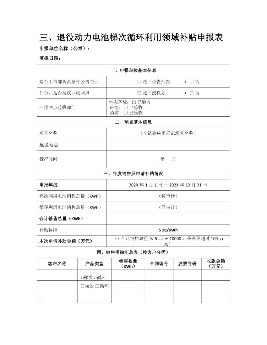 退役动力电池梯次循环利用领域:鼓励打造推动动力电池梯次利用示范应用场景。对搭建退役动力电池梯次利用、循环利用全链路应用示范场景,按照年度销售的合格梯次、循环利用电池容量,给予5元/KWh支持,单个企业支持一个项目,最高100万元。