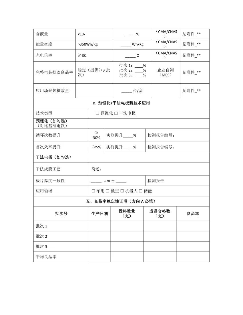 固态电池领域应用示范场景补贴申报要求固态电池含液量<1%、能量密度>350Wh/Kg、充电倍率≥3C、完整电芯批次良品率稳定(提供≥3批次);预锂化/干法电极新技术应用循环次数提升≥30%、首次效率提升≥5%。