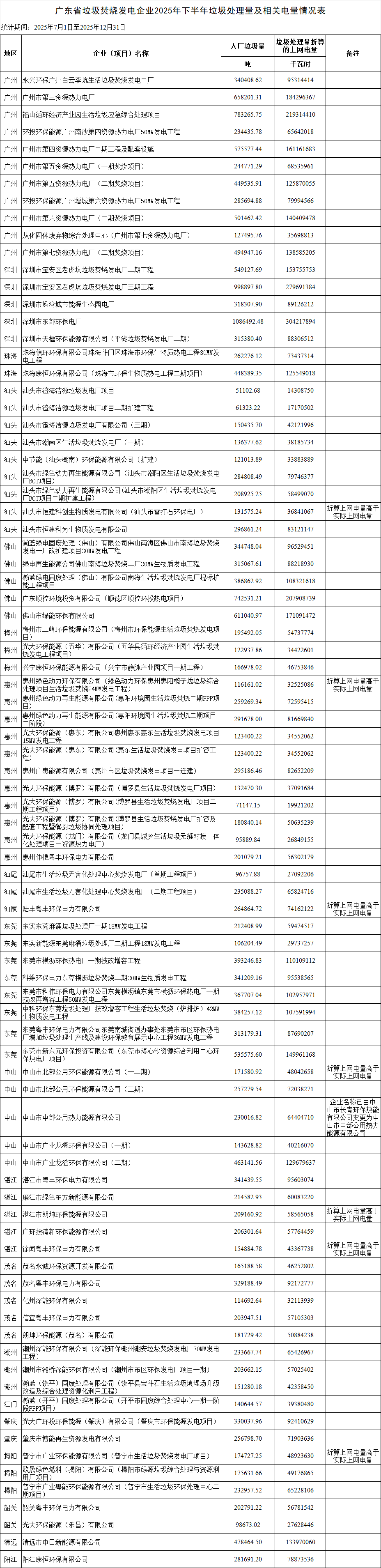 广东省发展改革委关于公布有关垃圾焚烧发电企业2025年下半年垃圾处理量及相关电量等事项的通知