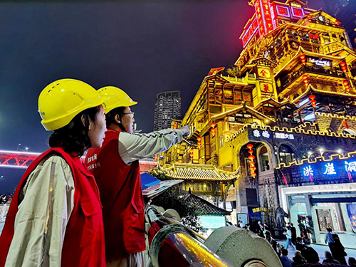 10月5日,国家电网重庆电力红岩(市区渝中)共产党员服务队在洪崖洞巡检,为国庆期间景区安全可靠供电保驾护航