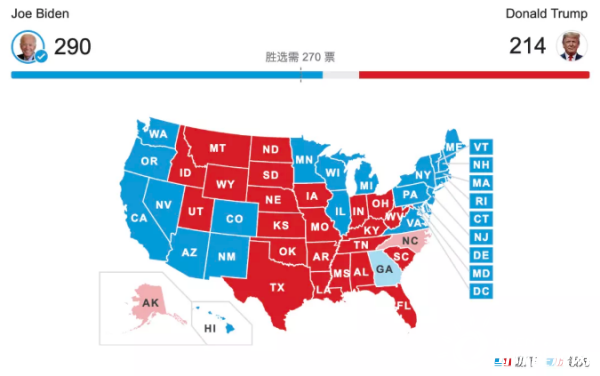 据美国多家媒体当地时间11月7日统计,美国民主党总统候选人乔·拜登已获得超过270张选举人票。根据选举规则,如果最终结果确认有效,率先获得270张选举人票的总统候选人获胜。