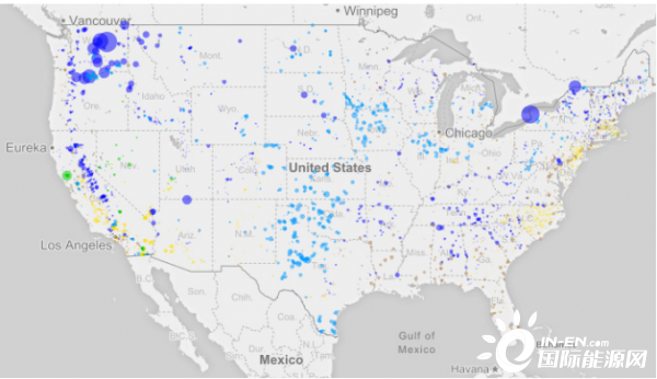 ▲美国清洁能源分布(深蓝色—水能,浅蓝色—风能,黄色—太阳能)