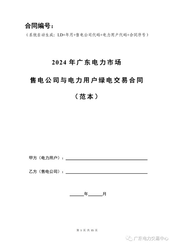 为扎实推进广东电力市场可再生能源交易市场体系建设,规范有序、高效灵活开展绿电零售市场交易,交易中心结合今年以来零售合同签订和市场主体反馈意见情况,组织完成了《2024 年广东电力市场售电公司与电力用户绿电交易合同 (范本)》修编。