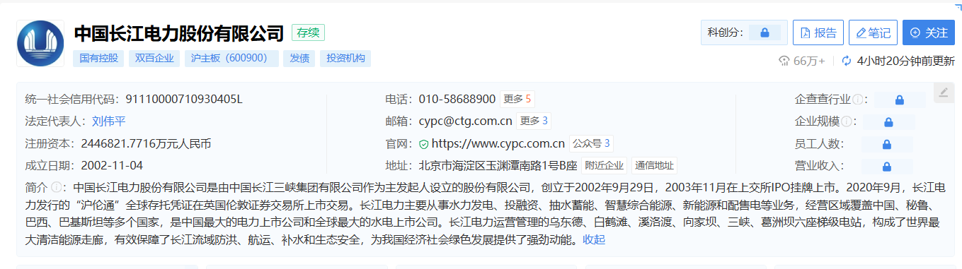 据企查查显示,日前,中国长江电力股份有限公司发生工商变更,注册资本由约227.42亿元增至约244.68亿元,雷鸣山卸任法定代表人、董事长,由刘伟平接任,同时,多位其他主要人员也发生变更。