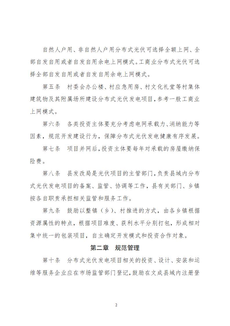为进一步加强对我县光伏项目的规范管理,保障分布式光伏发电项目前期管理、建设及后期运维的质量,推进分布式光伏开发利用健康有序发展,现将《文成县分布式光伏发电项目管理办法》(试行)印发给你们,请认真贯彻执行。