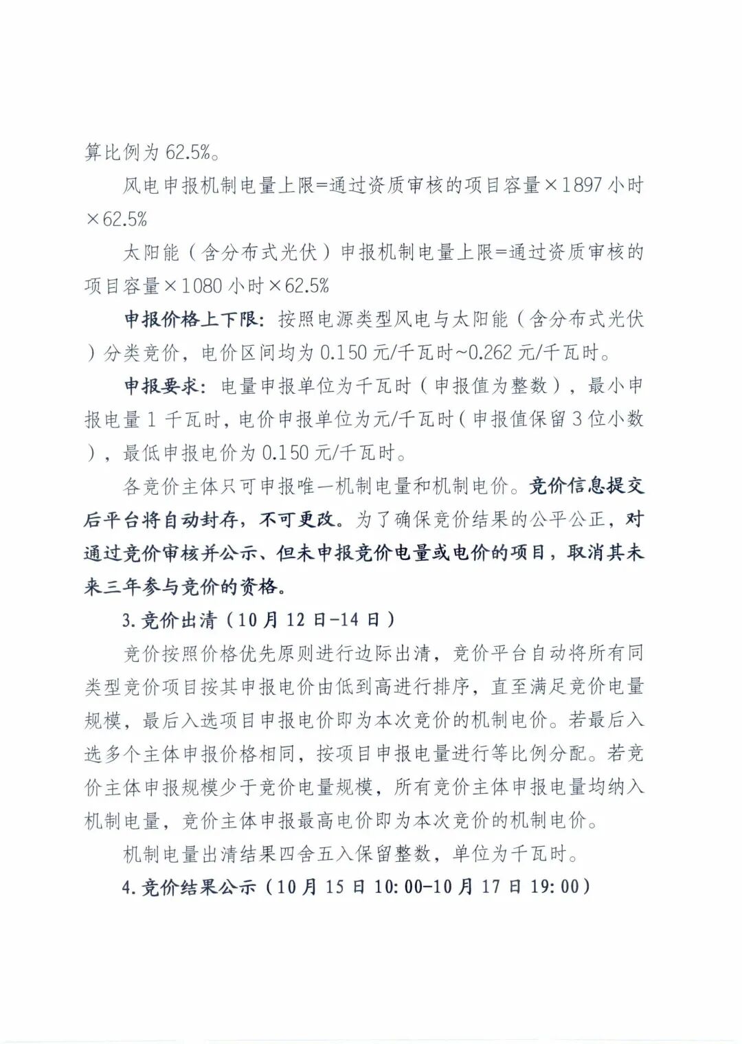 申报价格上下限:按照电源类型风电与太阳能(含分布式光伏)分类竞价,电价区间均为0.15元/千瓦时~0.262元/千瓦时。
