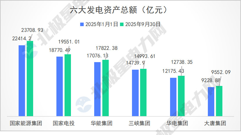 截至2025年三季度末,国家能源集团资产总额达23708.93亿元,居六大发电之首。国家电投、华能集团排在第二、第三,资产规模分别达到1.9万亿、1.7万亿。六大发电资产较年初均有增长,反映出持续的投资扩张态势。