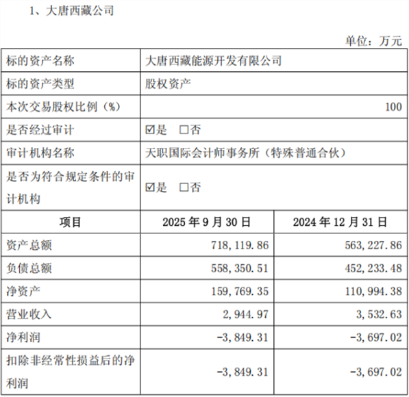 截至2024年底,大唐西藏公司资产总额约为56.32亿元,当年实现营业收入约0.35亿元、净利润约-0.37亿元。截至2025年9月30日,大唐西藏公司资产总额增至约71.81亿元,1-9月实现营业收入约0.29亿元、净利润约-0.38亿元。