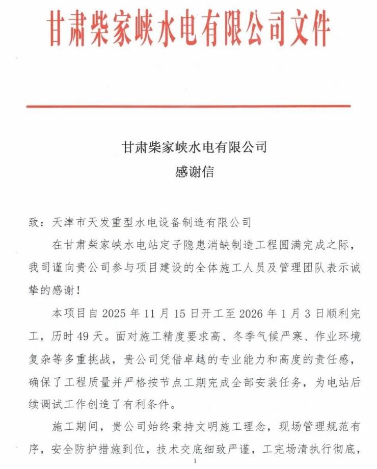 甘肃柴家峡水电站作为国家重点水电工程,四台转轮直径7.2米、单机容量24MW的灯泡贯流式水轮发电机组在区域电力供应、防洪灌溉等方面发挥着不可替代的综合作用。为确保项目顺利推进,天发水电公司组建了专业技术团队驻扎现场开展工作,充分发挥技术协同优势,结合老旧机组的结构特点和实际运行情况,精准把控技术适配性和运行安全性,攻克多个技术难题。改造后的定子设备不仅消除了原有安全隐患,降低了机组能耗,也为电站后续长期安全运行夯实了技术基础。此次改造项目的圆满完成,得到了业主方的高度认可和满意评价,特别送达感谢信对天发水电公司的专业能力和高效服务表示感谢。