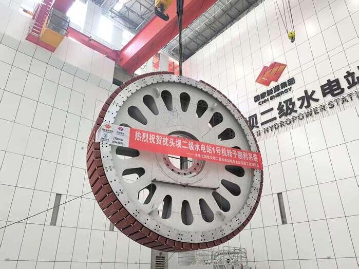 1月13日,枕头坝二级水电站最末机组(1号机组)转子成功吊装就位。