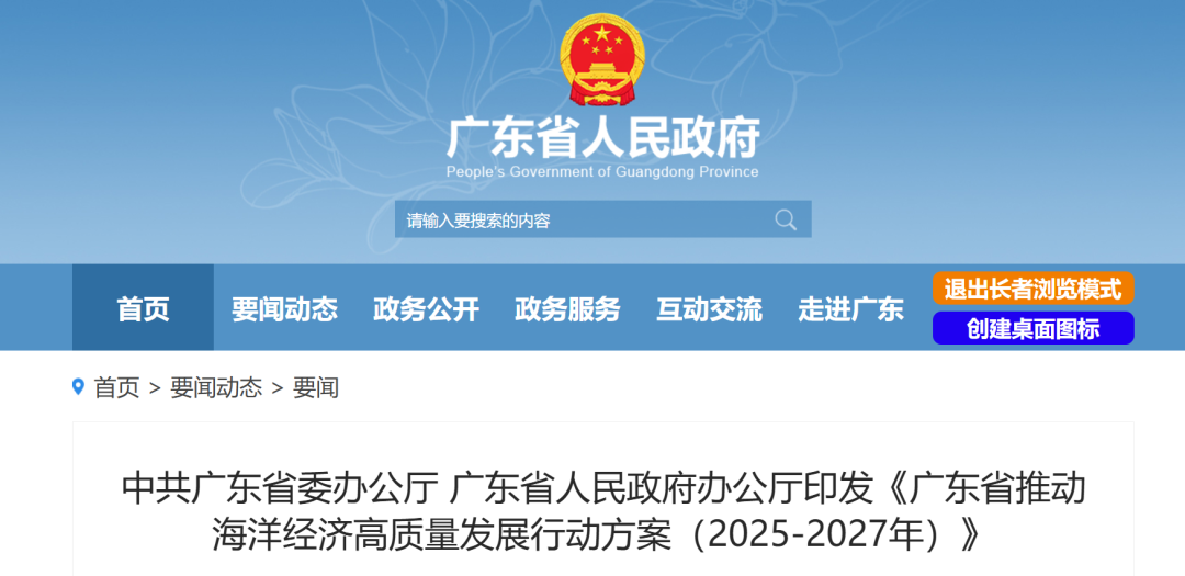 1月30日,中共广东省委办公厅广东省人民政府办公厅印发《广东省推动海洋经济高质量发展行动方案(2025-2027年)》。