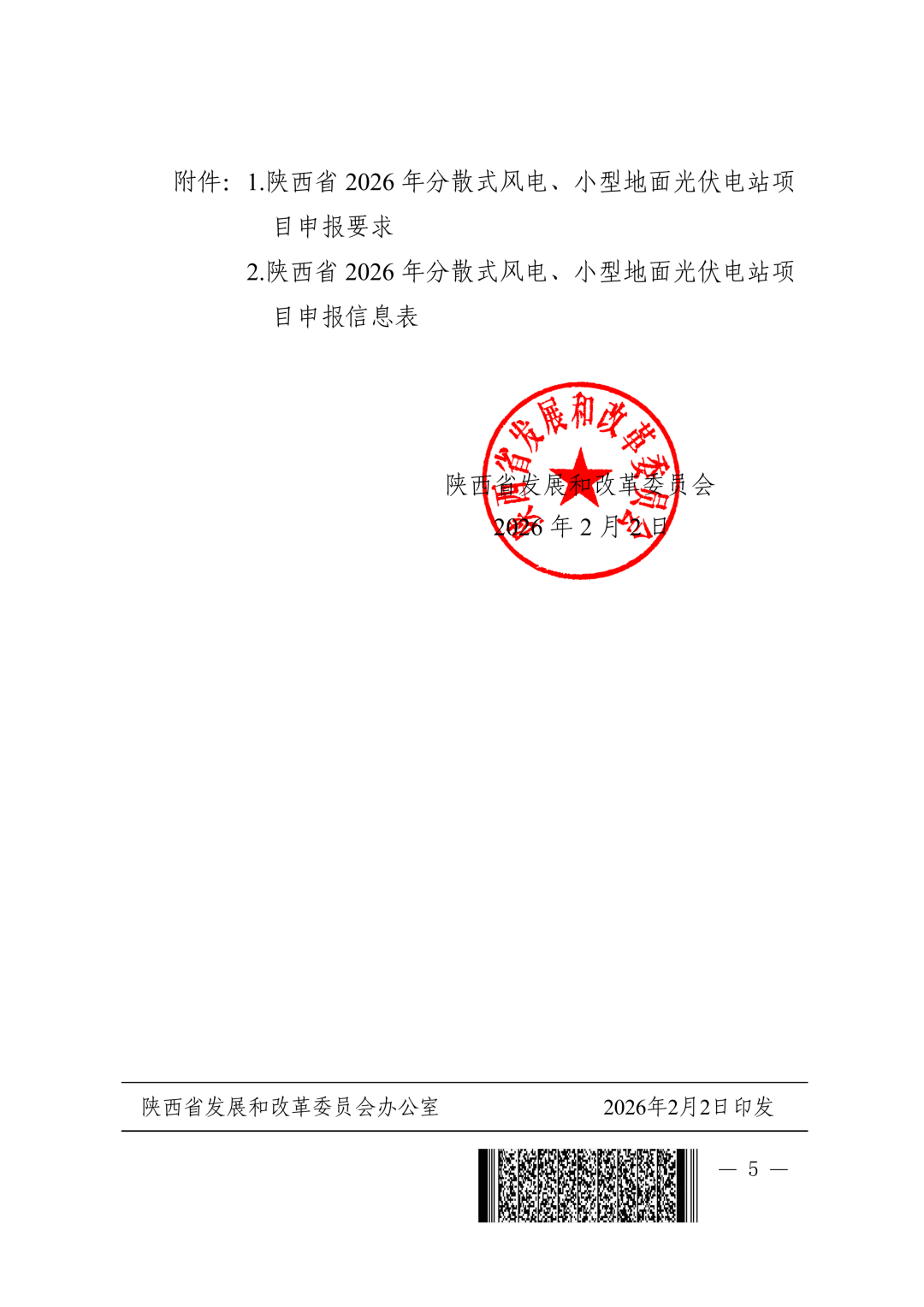 2月2日,陕西省发改委印发《关于开展陕西省2026年分散式风电 小型地面光伏电站项目申报工作的通知》。