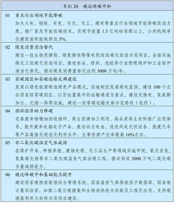 纲要明确积极稳妥推进和实现碳达峰,统筹发展和减排,扎实开展碳达峰行动,加快产业结构、能源结构、交通运输结构等调整优化,确保如期实现碳达峰目标。