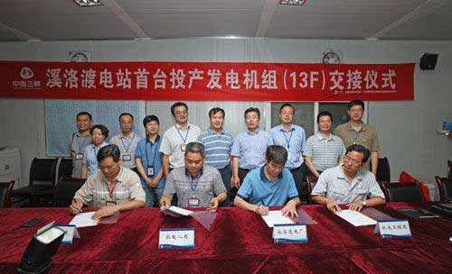 9时19分,溪洛渡电站首台投产发电机组(13F)交接仪式签字现场