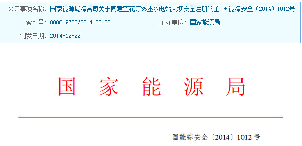 国家能源局综合司关于同意莲花等35座水电站大坝安全注册的函: