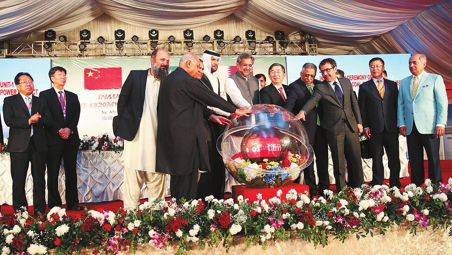 巴基斯坦总理阿巴西(右六)、中国电建董事长晏志勇(右五)、卡塔尔AMC公司董事长贾西姆(右七),以及与会嘉宾共同触摸启动机组的水晶球。 康从钦 摄